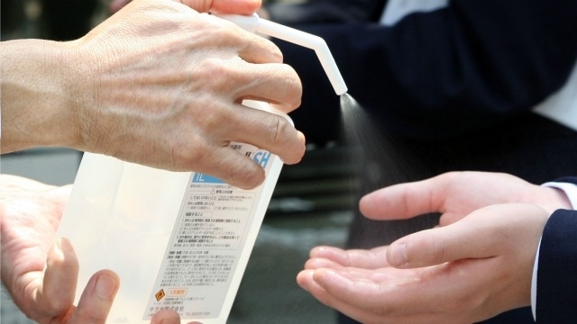 A man spraying hand sanitizer, an antibacterial product on other man's hand